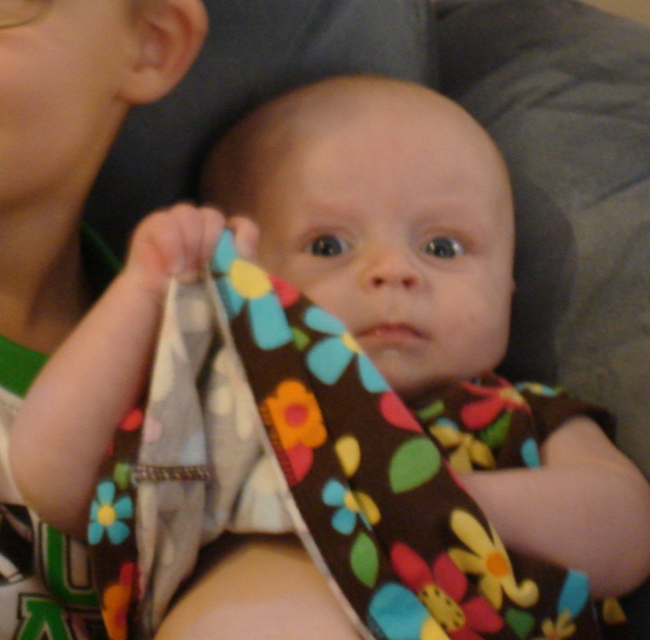 Other highlights include that she is actually beginning to wake-up happy vs. crying and wanting to eat. She "blew" her first raspberry over the weekend. She loves to watch The Backyardigans with her brother. I presume she like the bright characters and all the singing :)